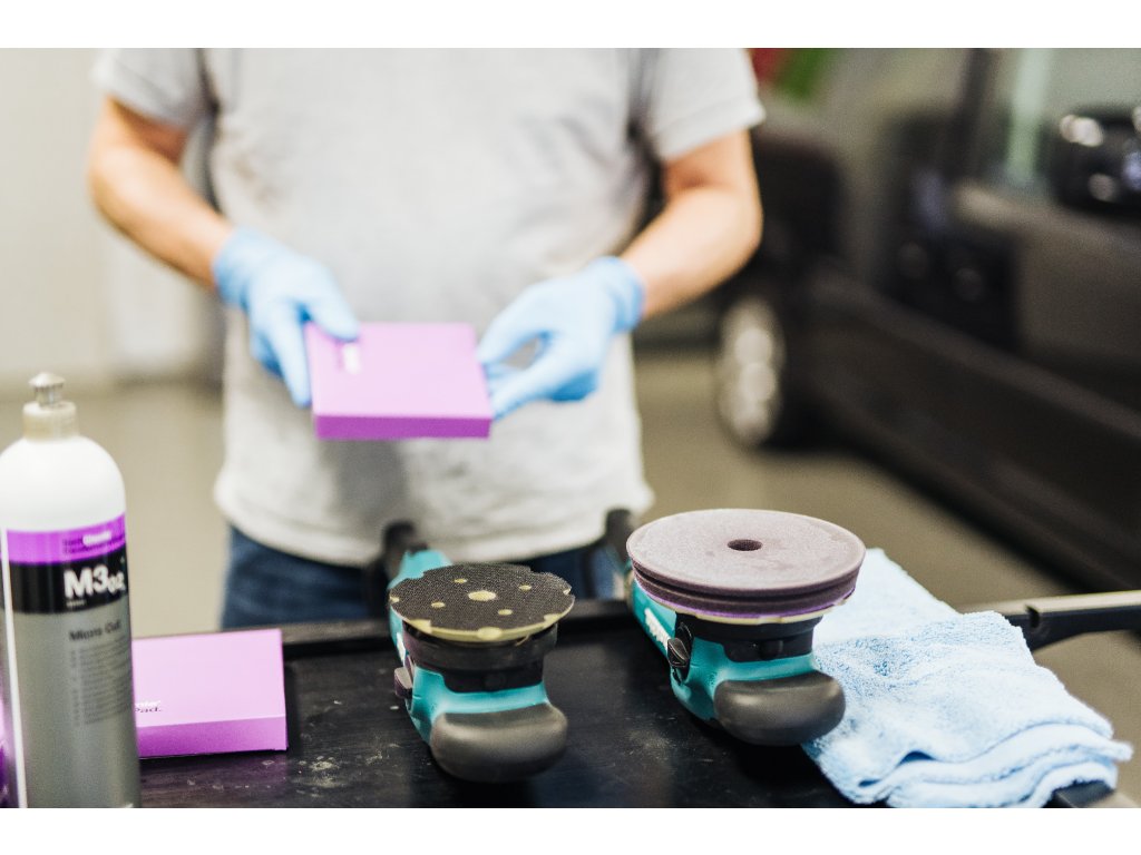 Použití: Povrch určený k leštění umyjte a vysušte. Před použitím leštící pastu dobře protřepejte a vyzkoušejte její vhodnost a snášenlivost. Za účelem vytvoření optimálních výsledků leštění doporučujeme při leštění používat náš leštící kotouč Micro Cut Pad fialový a excentrickou leštičku s nucenou rotací (např. Makita PO5000C, nejvyšší počet otáček). Na vysušené nebo nové lešticí kotouče naneste leštěnku, a to rovnoměrně na celý povrch kotouče. Leštičku nechejte ještě vypnutou a v tenké vrstvě rozetřete leštěnku po laku, následně leštěte mírným tlakem do kříže, dokud se nevytvoří transparentní film, to znamená, dokud se kompletně nerozpadne oxid hlinitý obsažený v leštěnce. Leštící kotouče používané na tento výrobek nepoužívejte pro jiné výrobky. Pro odstranění zbytků leštěnky bez škrábanců a rýh doporučujeme naši profesionální mikrovláknovou utěrku.