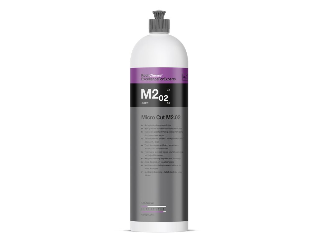 Popis přípravku: Micro Cut M2.02 je nejmodernější, finální, leštící, antihologramní pasta s vysokým leskem. Je určena pro strojové leštění na odstranění stop po leštění, hologramech a jemných škrábanců a ostrých částí až do zrnitosti brusného papíru o velikosti 3 000. Je vhodná pro vozidla, která mají měkké laky např. Volvo, Renault, Peugot. Díky použití vysoce specializovaných a extrémně homogenních brusných částic se dosáhne na tmavých a podobně citlivých barevných odstínech při extrémních světelných podmínkách brilantní a trvale vysoký lesk. Hologramy a jemné škrábance se mechanicky odstraní. S antihologramní leštěnkou s vysokým leskem Micro Cut M2.02 se velice dobře leští a lze ji beze zbytků odstranit.