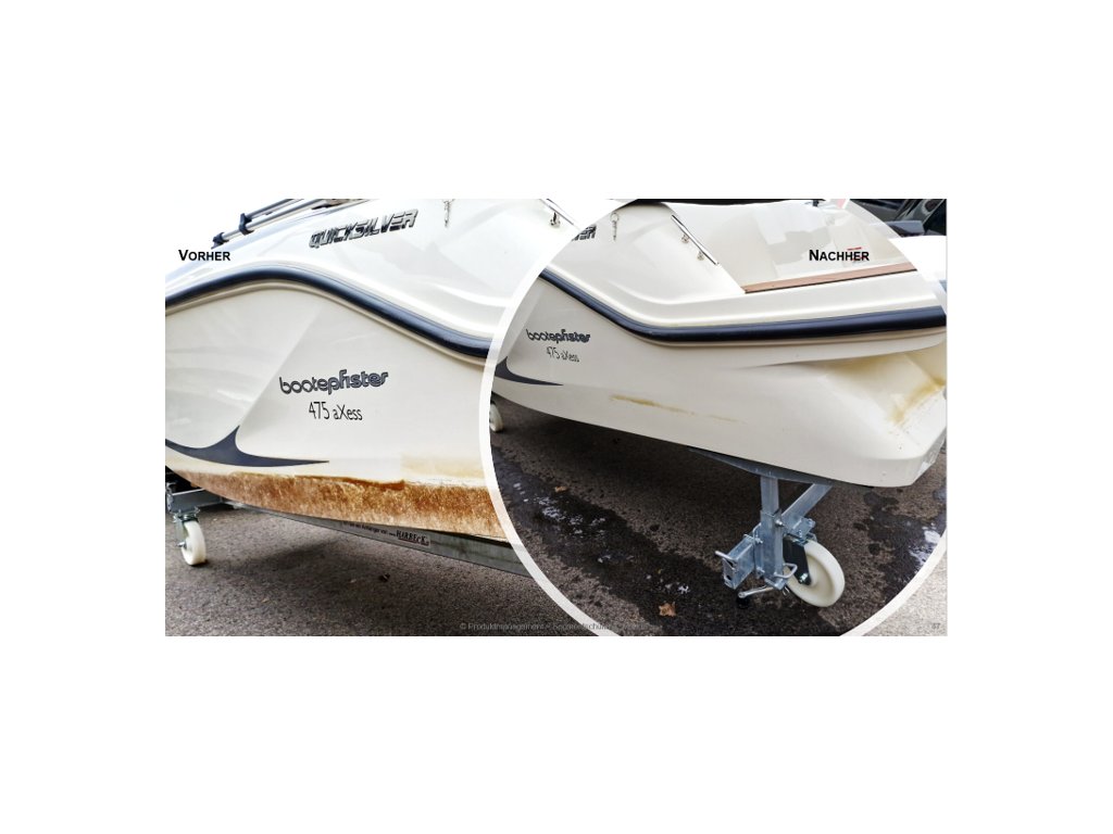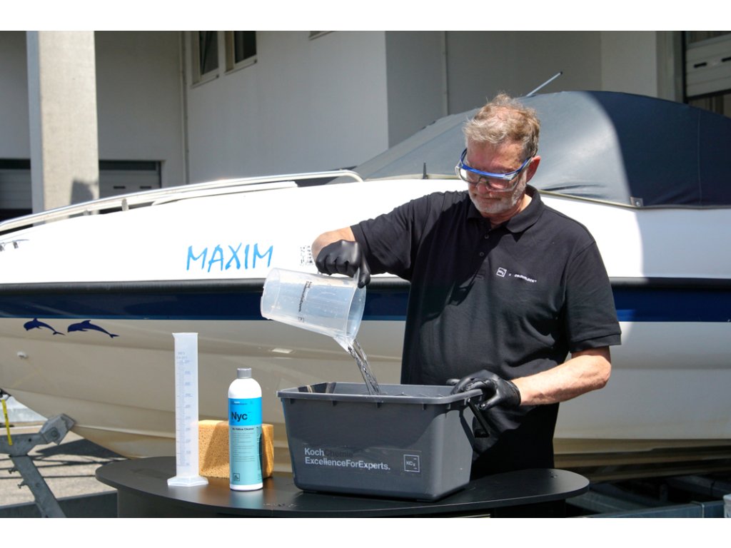 Popis přípravku: Ředitelný čisticí prostředek pro snadné odstranění žloutnutí a nažloutlých řas v gelcoatu, plastu a laku. Snadná a účinná aplikace pomocí kartáče pro předmytí v oblasti přední paluby, jakož i vodorysky, oblasti výfuku nebo čela, vede k okamžitému účinku bez čekání. Díky neutrálnímu složení přípravku No Yellow Cleaner nejsou povrchy jako plast, nerezová ocel a hliník napadány. Účinný proti řasám, rzi, sazím, a to i v oblasti výfuku.