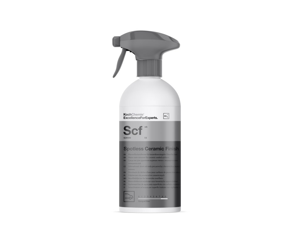 Popis přípravku: Spotless Ceramic Finish je vhodný pro šetrné odstranění skvrn od vody a vodního kamene na vozidlech s keramickou konzervační vrstvou, bez poškození konzervační vrstvy. Jeho použitím se z konzervační vrstvy snadno odstraní čerstvé skvrny od vodního kamene. Ošetřený povrch navíc znovu získá přesvědčivé zvýraznění barvy, lesk bez šmouh a svou původní hladkost.