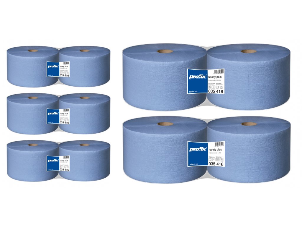 Role modré, 2-vrstvé, perforované, plošně ražené, materiál 100 % recyklovaný papír z vybraných surovin, vysoká schopnost vstřebávání tekutin, např., olej, voda.