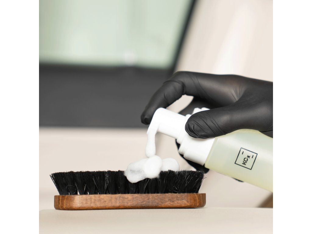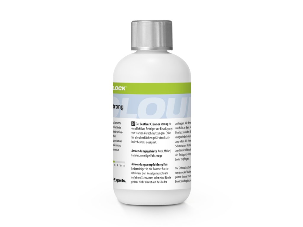 Popis přípravku: Čistič kůže Strong je účinný čistič pro odstraňování silných nečistot. Je ideální pro všechny povrchově barvené hladké kůže. Přípravek důkladně a bezpečně odstraňuje i velmi odolné skvrny, nečistoty, zbytky předchozích impregnací a některá lehčí přebarvení od textilního a novinového barviva. Snadno si poradí i s mastnými či olejovými skvrnami. při použití aplikátoru suché pěny je čištění mnohem snazší, účinnější a šetrnější. Při aplikaci nedochází ke kontaktu s vodou, která by mohla poškodit povrchovou úpravu koženého materiálu a způsobit jeho následné tvrdnutí. Nestírá barvu z povrchu usně, ale obnovuje její přirozený vzhled. Prostředek také zmírňuje nepříjemné zápachy jako jsou například, cigaretový kouř nebo zvířecí zápach a napomáhá tak uvolňovat charakteristickou vůni usně.